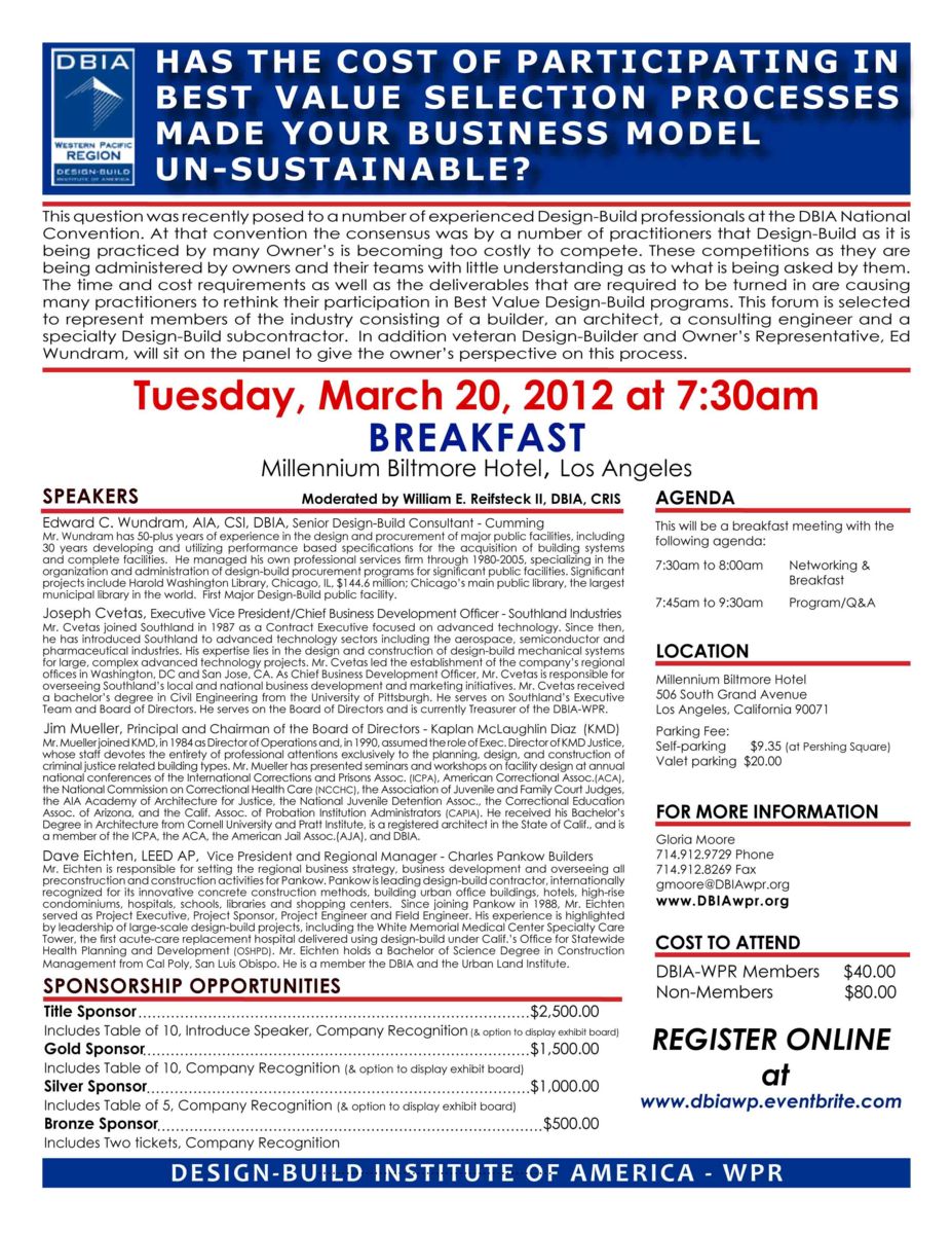 Description: Breakfast Program presentation, "HAS THE COST OF PARTICIPATING IN BEST VALUE SELECTION PROCESSES MADE YOUR BUSINESS MODEL UN-SUSTAINABLE?" This question was recently posed to a number of experienced Design-Build professionals at the DBIA National Convention. At that convention the consensus was by a number of practitioners that Design-Build as it is being practiced by many Owner’s is becoming too costly to compete. These competitions as they are being administered by owners and their teams with little understanding as to what is being asked by them. The time and cost requirements as well as the deliverables that are required to be turned in are causing many practitioners to rethink their participation in Best Value Design-Build programs.