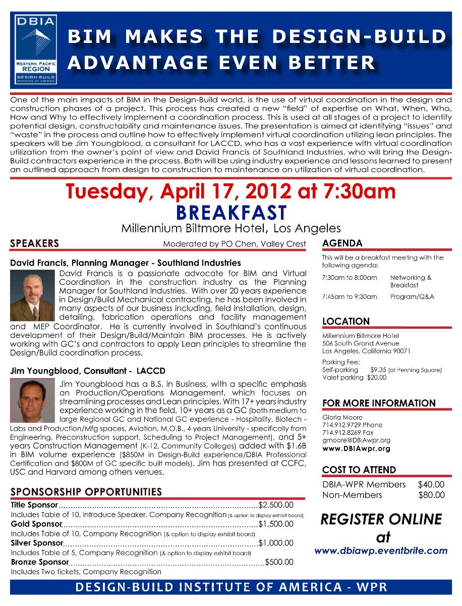 One of the main impacts of BIM in the Design-Build world, is the use of virtual coordination in the design and construction phases of a project. This process has created a new “field” of expertise on What, When, Who, How and Why to effectively implement a coordination process. The speakers will be Jim Youngblood, a consultant for LACCD, who has a vast experience with virtual coordination utilization from the owner’s point of view and David Francis of Southland Industries, who will bring the Design- Build contractors experience in the process. Both will be using industry experience and lessons learned to present an outlined approach from design to construction to maintenance on utilization of virtual coordination.
