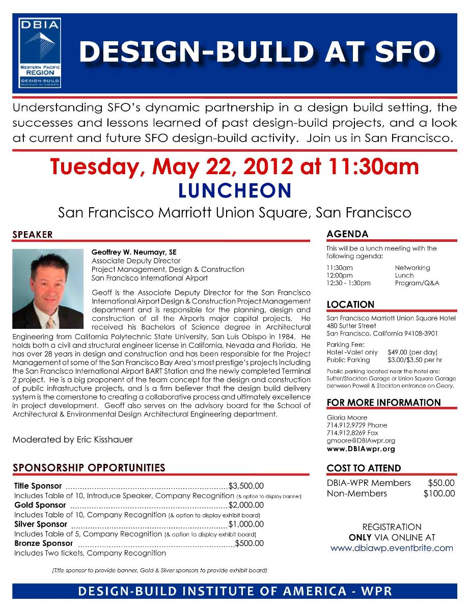 Description: "DESIGN-BUILD AT SFO" with Mr. Geoffrey W. Neumayr, SE - Associate Deputy Director, Project Management, Design and Construction, San Francisco International Airport.