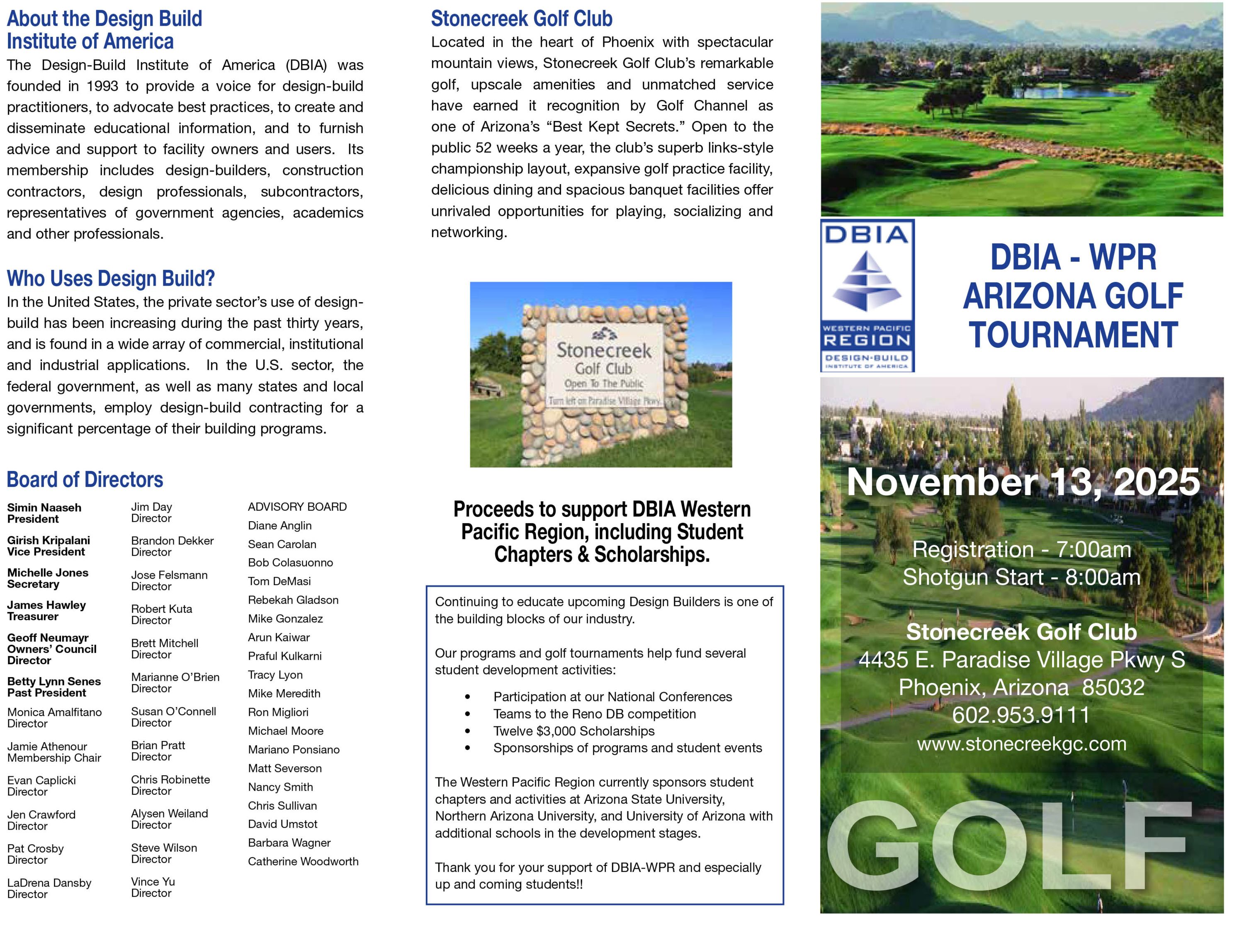 Description: DBIA-WPR Arizona Chapter Annual Golf Tournament. Four-person scramble. All golfers receive tournament prize, refreshments, and lunch. Individual and team prizes will be awarded.
