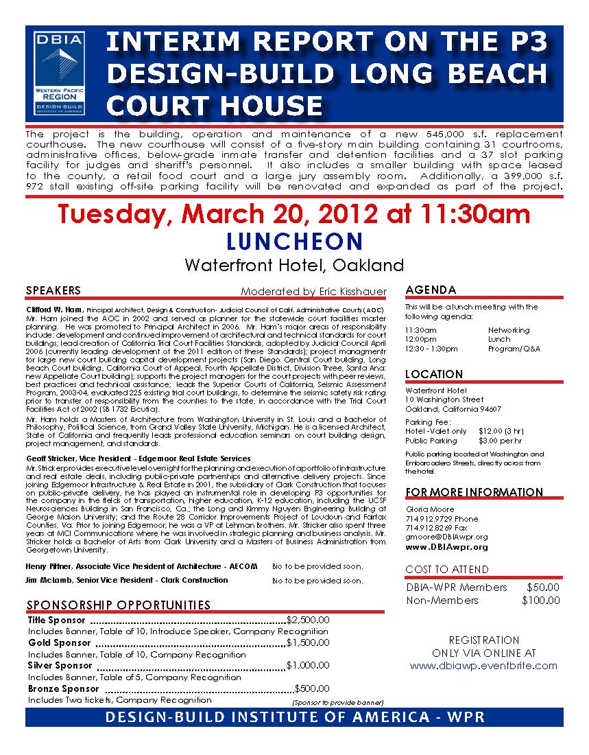 Description: Luncheon program presentation “Interim Report on the P3 Design-Build Long Beach Court House.”