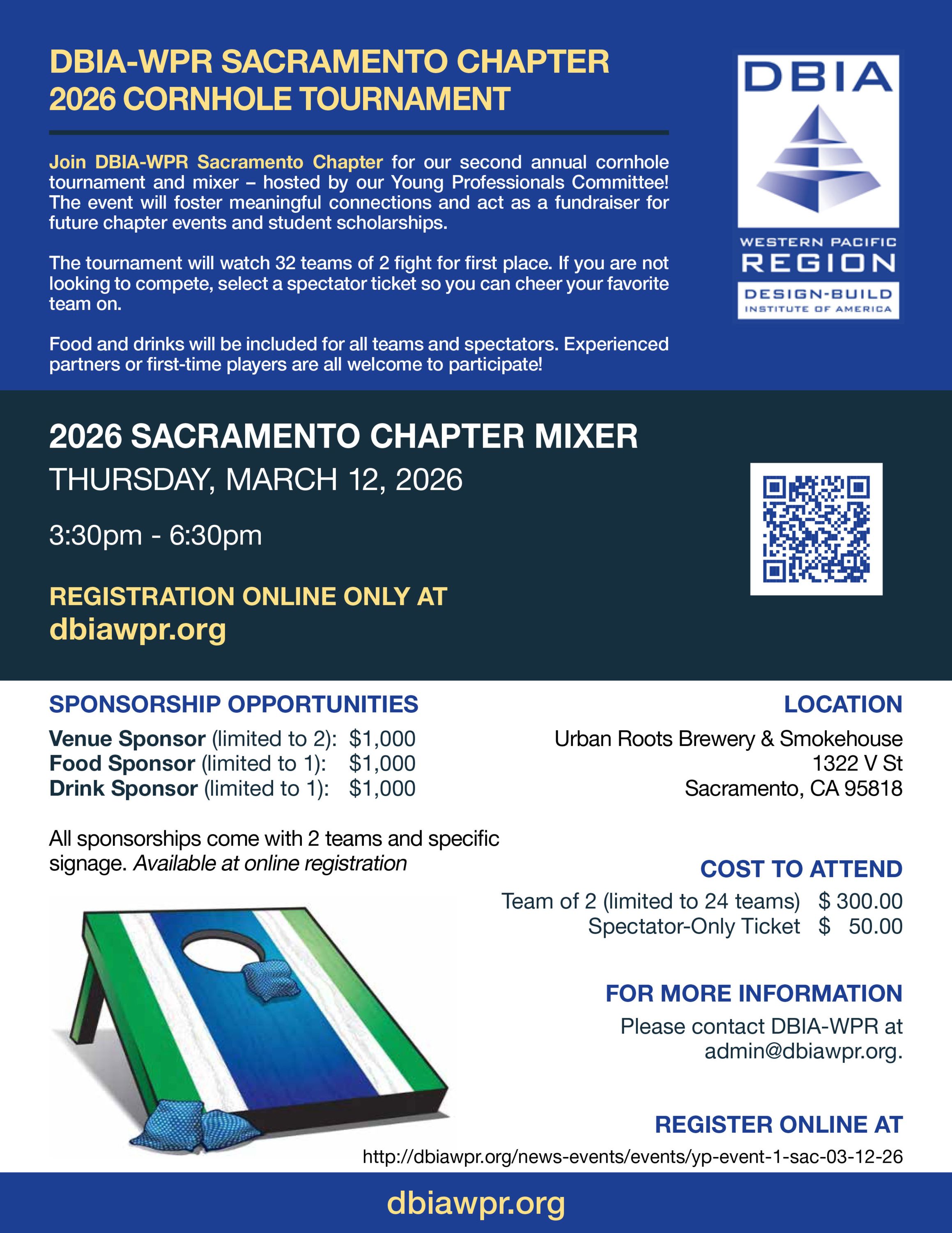 Description: DBIA-WPR Sacramento Chapter Cornhole Tournament. Join DBIA-WPR Sacramento Chapter for our second annual cornhole tournament and mixer – hosted by our Young Professionals Committee! The event will foster meaningful connections and act as a fundraiser for future chapter events and student scholarships.
