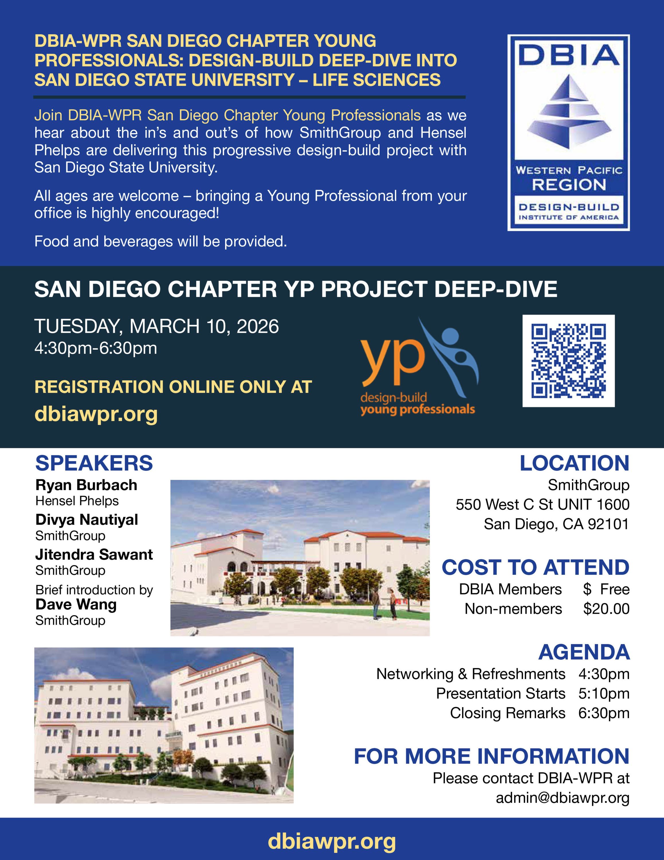 Description: DBIA-WPR San Diego Chapter YP Event #1, DESIGN-BUILD DEEP-DIVE INTO SAN DIEGO STATE UNIVERSITY – LIFE SCIENCES. Join DBIA-WPR San Diego Chapter Young Professionals as we hear about the in’s and out’s of how SmithGroup and Hensel Phelps are delivering this progressive design-build project with San Diego State University.