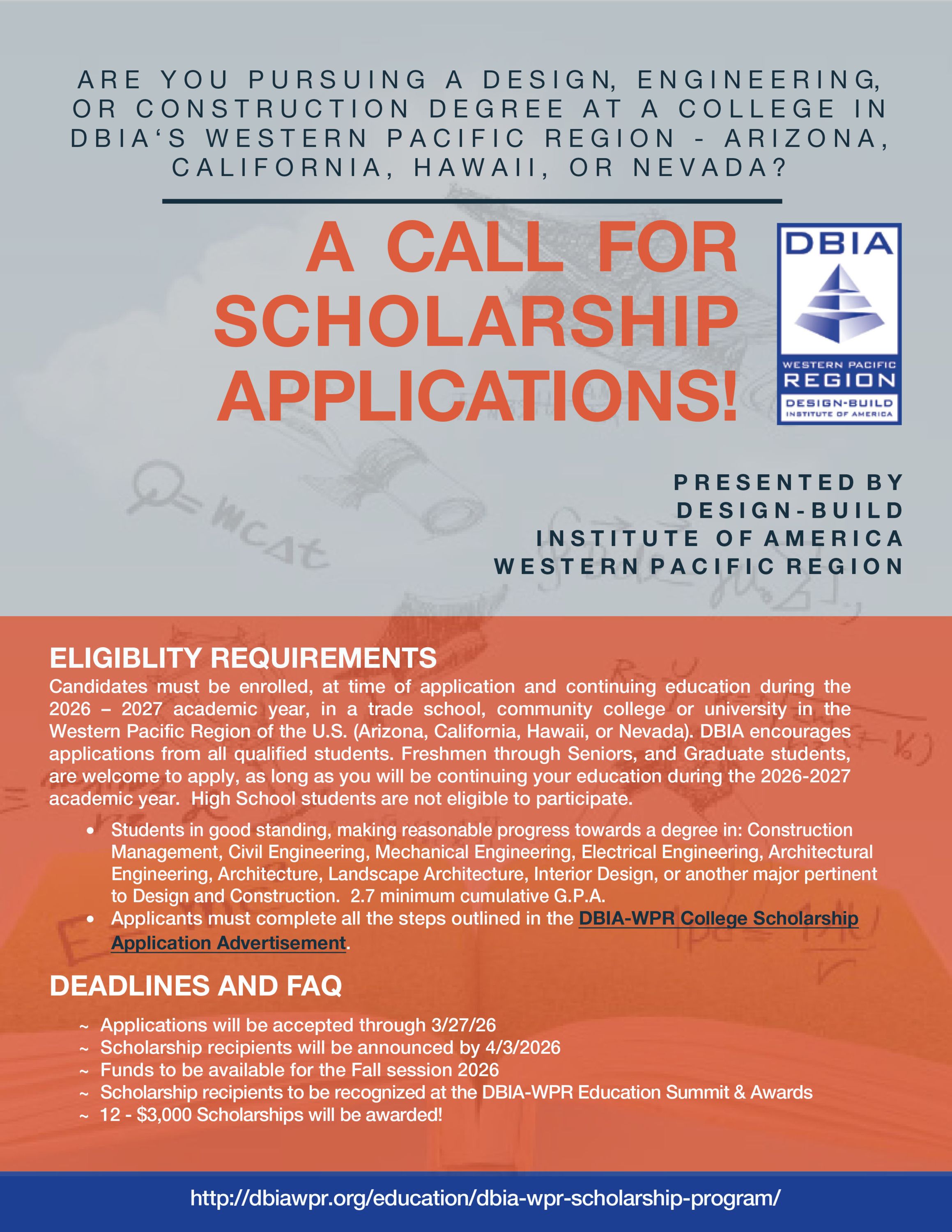 DBIA Western Pacific Region will be offering scholarships to students in good standing, making reasonable progress towards a degree in: Construction Management, Civil Engineering, Mechanical Engineering, Electrical Engineering, Architectural Engineering, Architecture, Landscape Architecture, Interior Design, or another major pertinent to Design and Construction at universities in California, Arizona, Hawaii and Nevada.