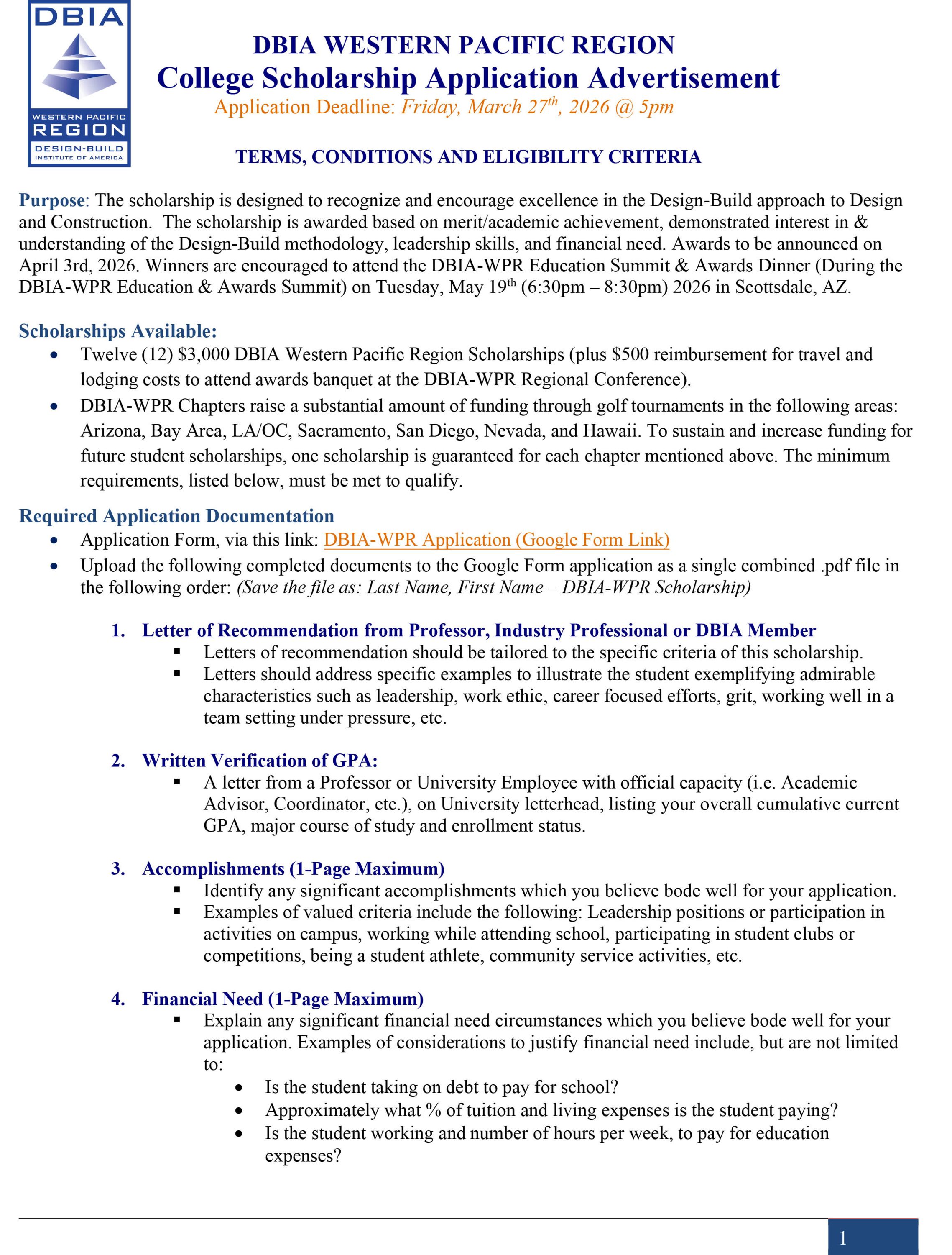 DBIA-WPR STUDENT 2026 SCHOLARSHIP PROGRAM