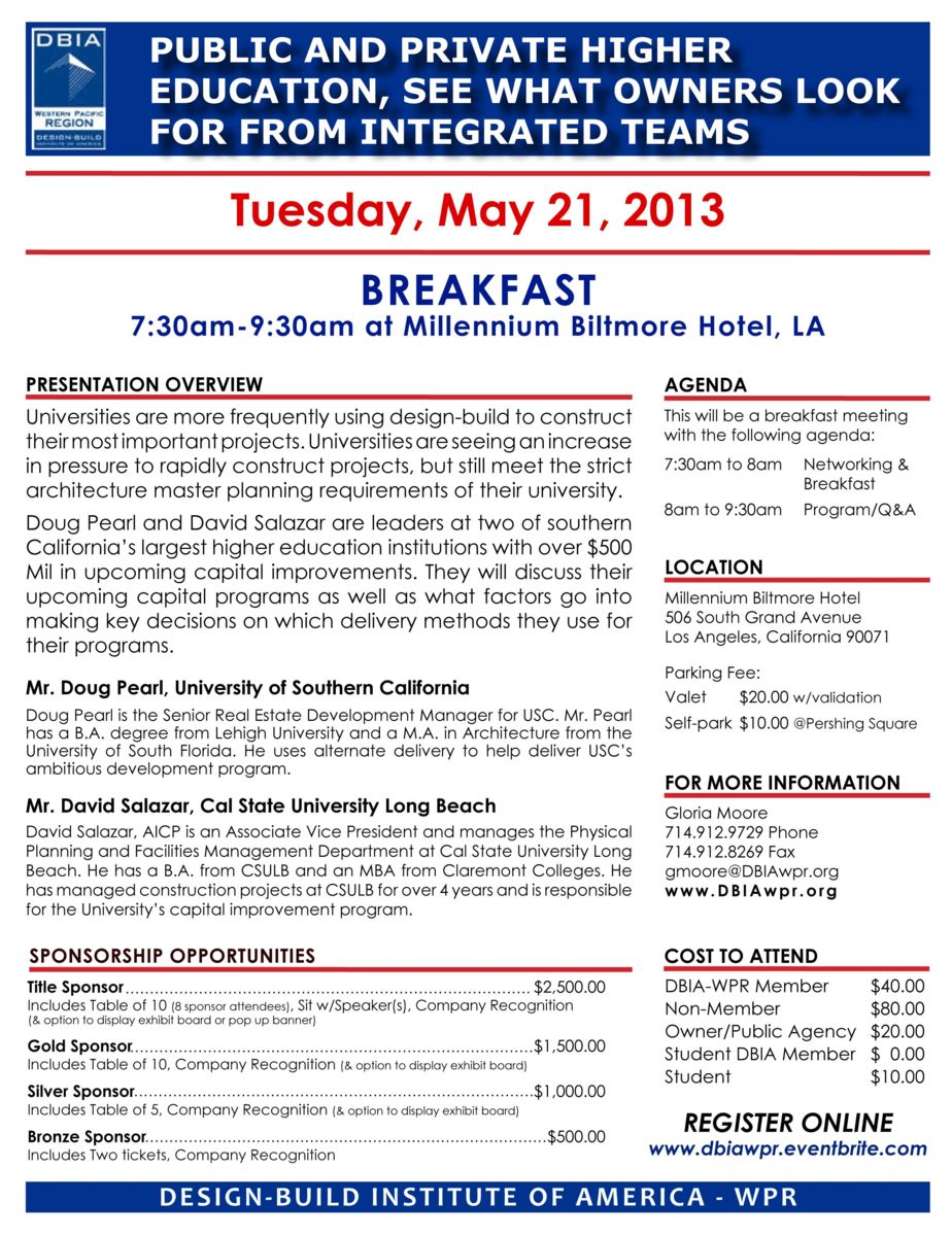 Description: LA/OC Breakfast program, "PUBLIC AND PRIVATE EDUCATION, SEE WHAT OWNERS LOOK FOR FROM INTERGRATED TEAMS" presented by Mr. Doug Pearl from University of Southern California and Mr. David Salazar from Cal State University Long Beach.