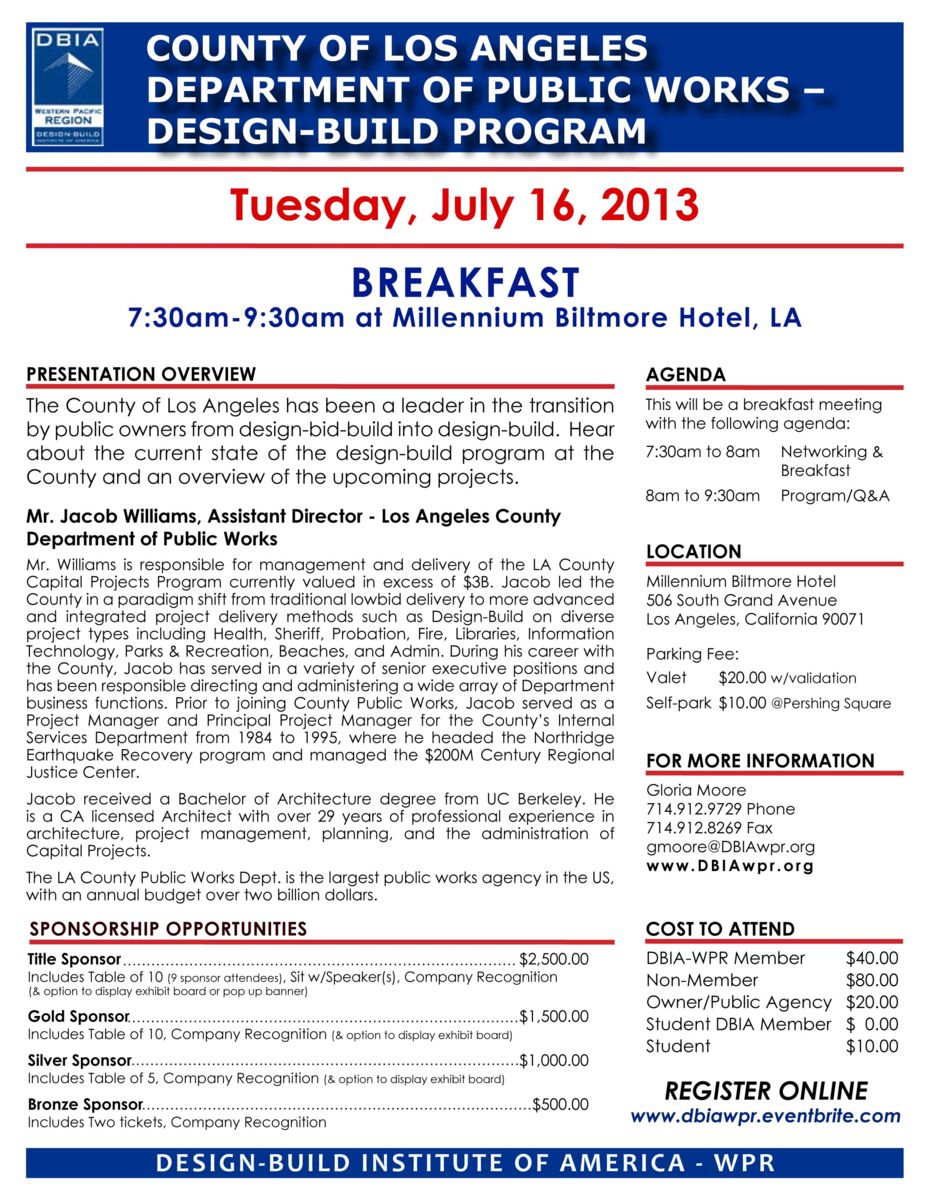 Description: LA/Orange County breakfast program, "County of Los Angeles Department of Public Works Design-Build Program", presented by Jacob Williams.