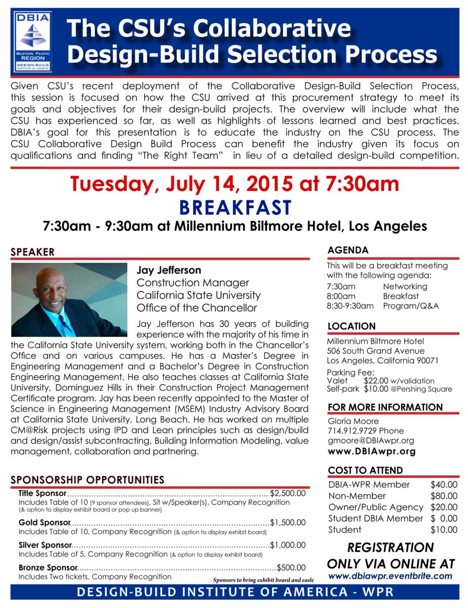 Description: LA Breakfast presentation, "The CSU's Collaborative Design-Build Selection Process" with the following speaker: Jay Jefferson, Construction Manager, California State University, Office of the Chancellor