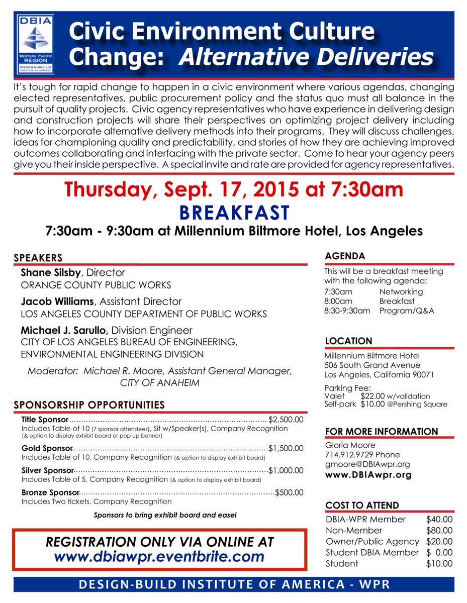 Description: LA Breakfast presentation, "Civic Environment Culture Change: Alternative Deliveries" with the following speakers:
