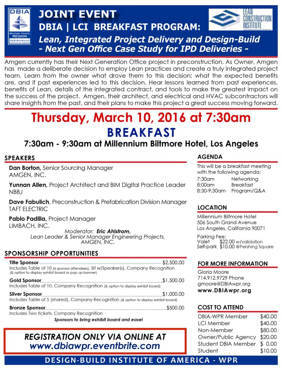 Description: Los Angeles/Orange Chapter Breakfast Program: JOINT EVENT-DBIA/LCI: "LEAN, INTEGRATED PROJECT DELIVERY AND DESIGN-BUILD - NEXT GEN OFFICE CASE STUDY FOR IPD DELIVERIES -"