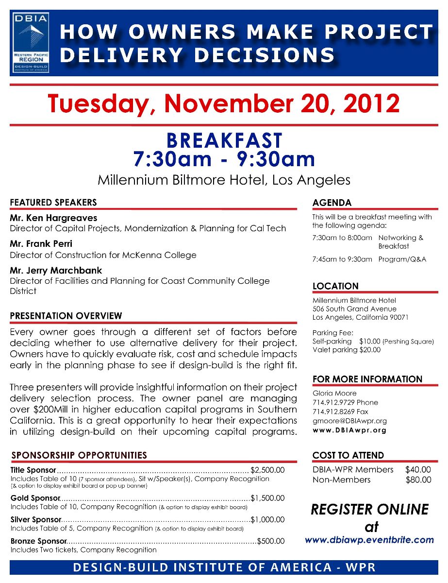 Description: Breakfast Program in Los Angeles, "HOW OWNERS MAKE PROJECT DELIVERY DECISIONS." Every owner goes through a different set of factors before deciding whether to use alternative delivery for their project. Owners have to quickly evaluate risk, cost and schedule impacts early in the planning phase to see if design-build is the right fit. These presenters will provide insightful information on their project delivery selection process. The owner panel are managing higher education capital programs in Southern California. This is a great opportunity to hear their expectations in utilizing design-build on their upcoming capital programs.