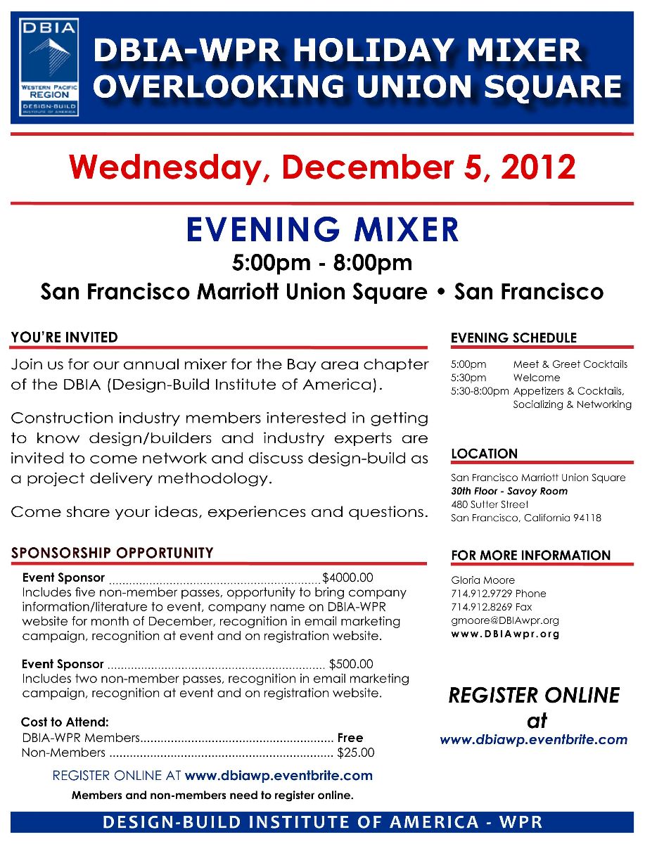 Join us for our annual mixer for the Bay area chapter of the DBIA (Design-Build Institute of America). Construction industry members interested in getting to know design/builders and industry experts are invited to come network and discuss design-build as a project delivery methodology.