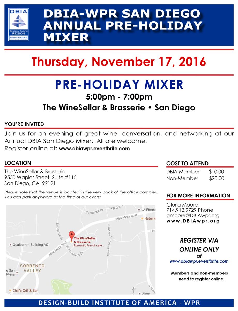 Description: DBIA-WPR San Diego Annual Pre-Holiday Mixer. Join us for an evening of great wine, conversation, and networking at our Annual DBIA San Diego Mixer. All are welcome!