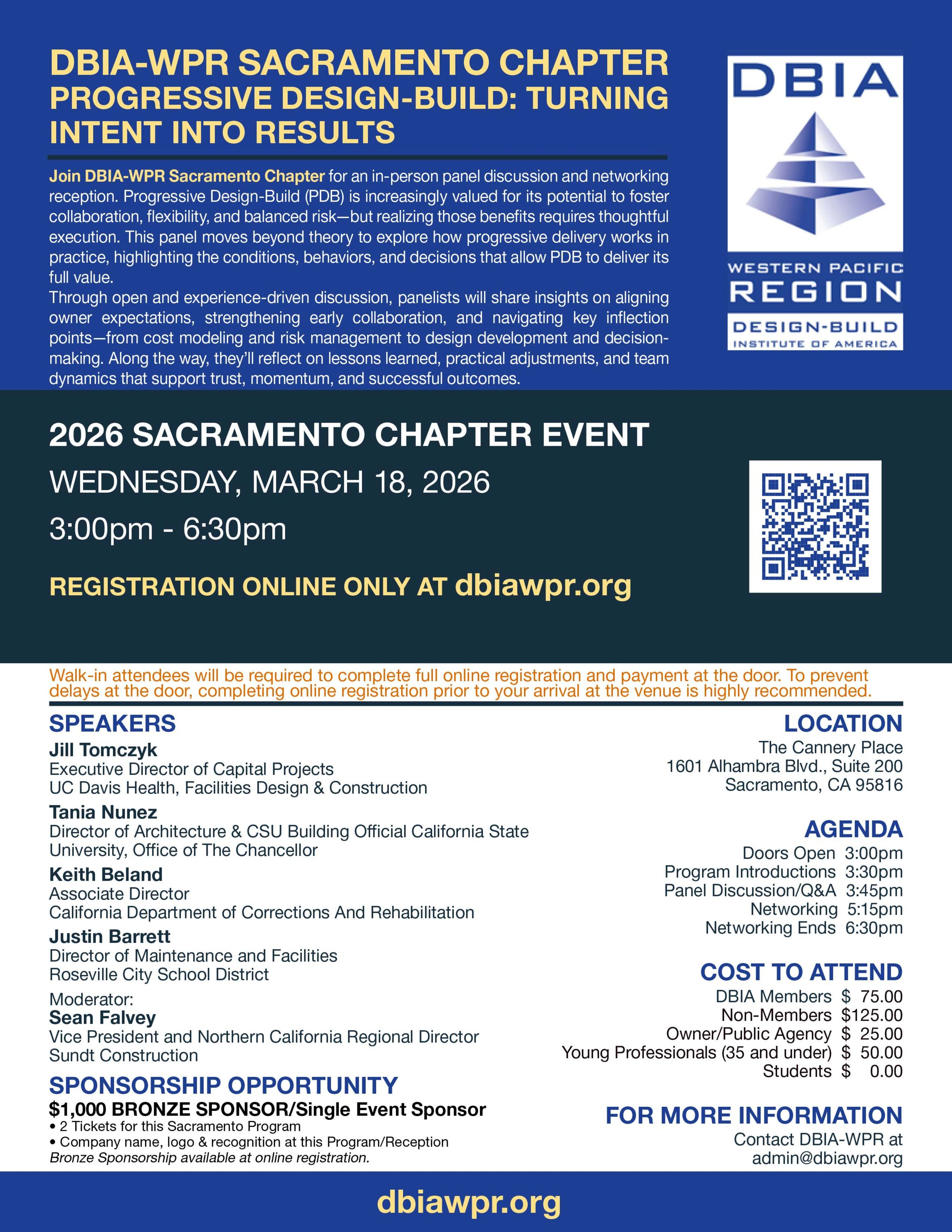 Description: DBIA-WPR Sacramento Chapter Event #1, PROGRESSIVE DESIGN-BUILD: TURNING INTENT INTO RESULTS. Join DBIA-WPR Sacramento Chapter for an in-person panel discussion and networking reception. Progressive Design-Build (PDB) is increasingly valued for its potential to foster collaboration, flexibility, and balanced risk—but realizing those benefits requires thoughtful execution. This panel moves beyond theory to explore how progressive delivery works in practice, highlighting the conditions, behaviors, and decisions that allow PDB to deliver its full value.