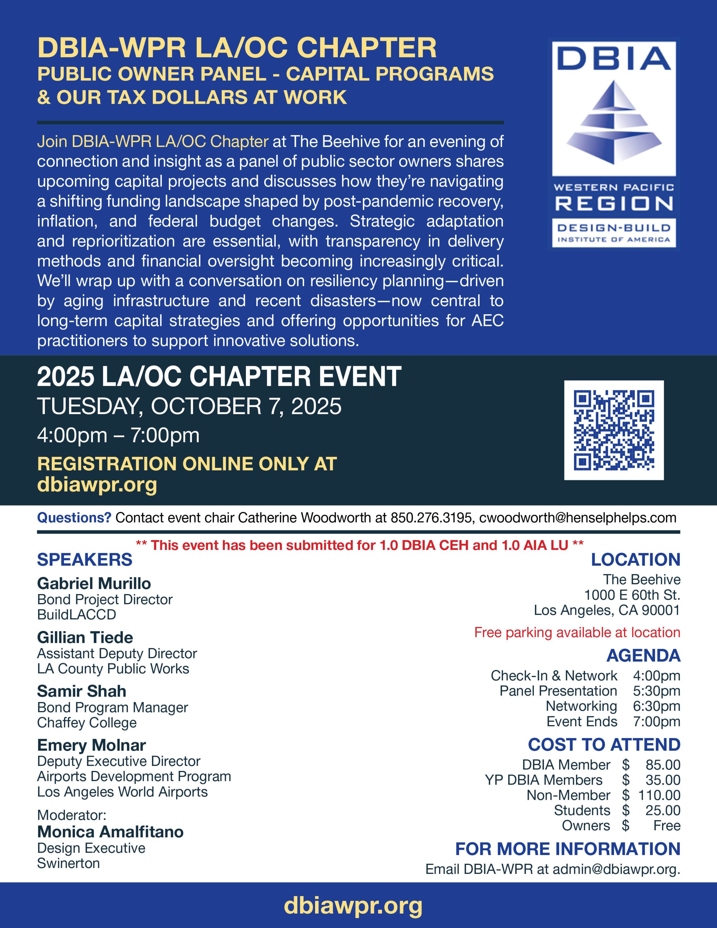 Description: DBIA-WPR LA/OC Chapter Event, PUBLIC OWNER PANEL - CAPITAL PROGRAMS & OUR TAX DOLLARS AT WORK. Join DBIA-WPR LA/OC Chapter at The Beehive for an evening of connection and insight as a panel of public sector owners shares upcoming capital projects and discusses how they’re navigating a shifting funding landscape shaped by post-pandemic recovery, inflation, and federal budget changes. Strategic adaptation and reprioritization are essential, with transparency in delivery methods and financial oversight becoming increasingly critical. We’ll wrap up with a conversation on resiliency planning—driven by aging infrastructure and recent disasters—now central to long-term capital strategies and offering opportunities for AEC practitioners to support innovative solutions.
