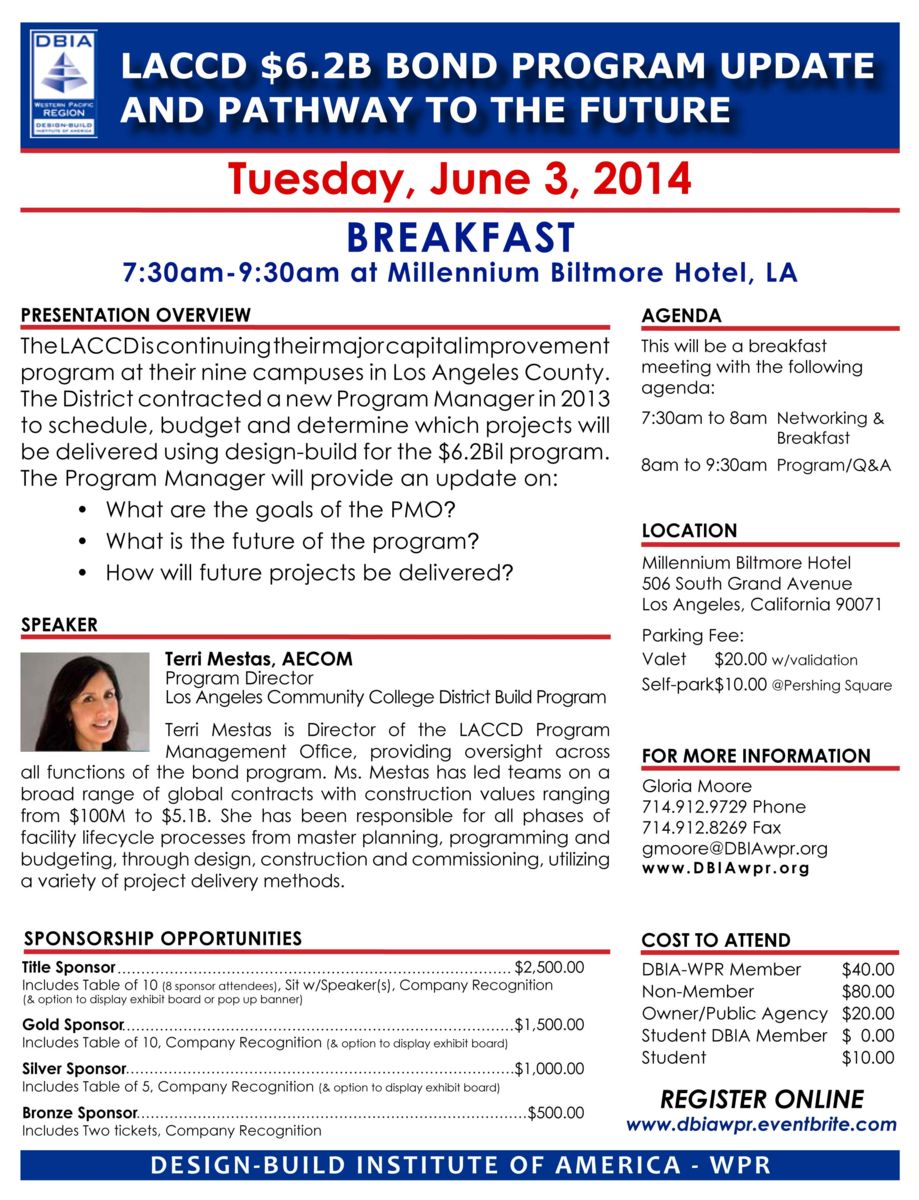 Description: LA Breakfast Program presentation, "LACCD $6.2B Bond Program Update and Pathway to the Future." Speaker: Terri Mestas, AECOM - Program Director, Los Angeles Community College District Build Program. The LACCD is continuing their major capital improvement program at their nine campuses in Los Angeles County. The District contracted a new Program Manager in 2013 to schedule, budget and determine which projects will be delivered using design-build for the $6.2Bil program. The Program Manager will provide an update on: