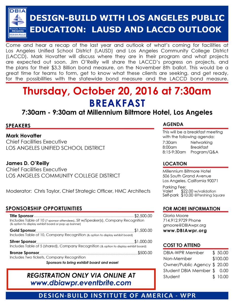 Come and hear a recap of the last year and outlook of what’s coming for facilities at Los Angeles Unified School District (LAUSD) and Los Angeles Community College District (LACCD). Mark Hovatter will discuss where they are in their program and what projects are expected out soon. Jim O’Reilly will share the LACCD’s progress on projects, and the plans for their $3.3 Billion bond measure, on the November 8th ballot. This would be a great time for teams to form, get to know what these clients are seeking, and get ready, for the possibilities with the statewide bond measure and the LACCD bond measure.