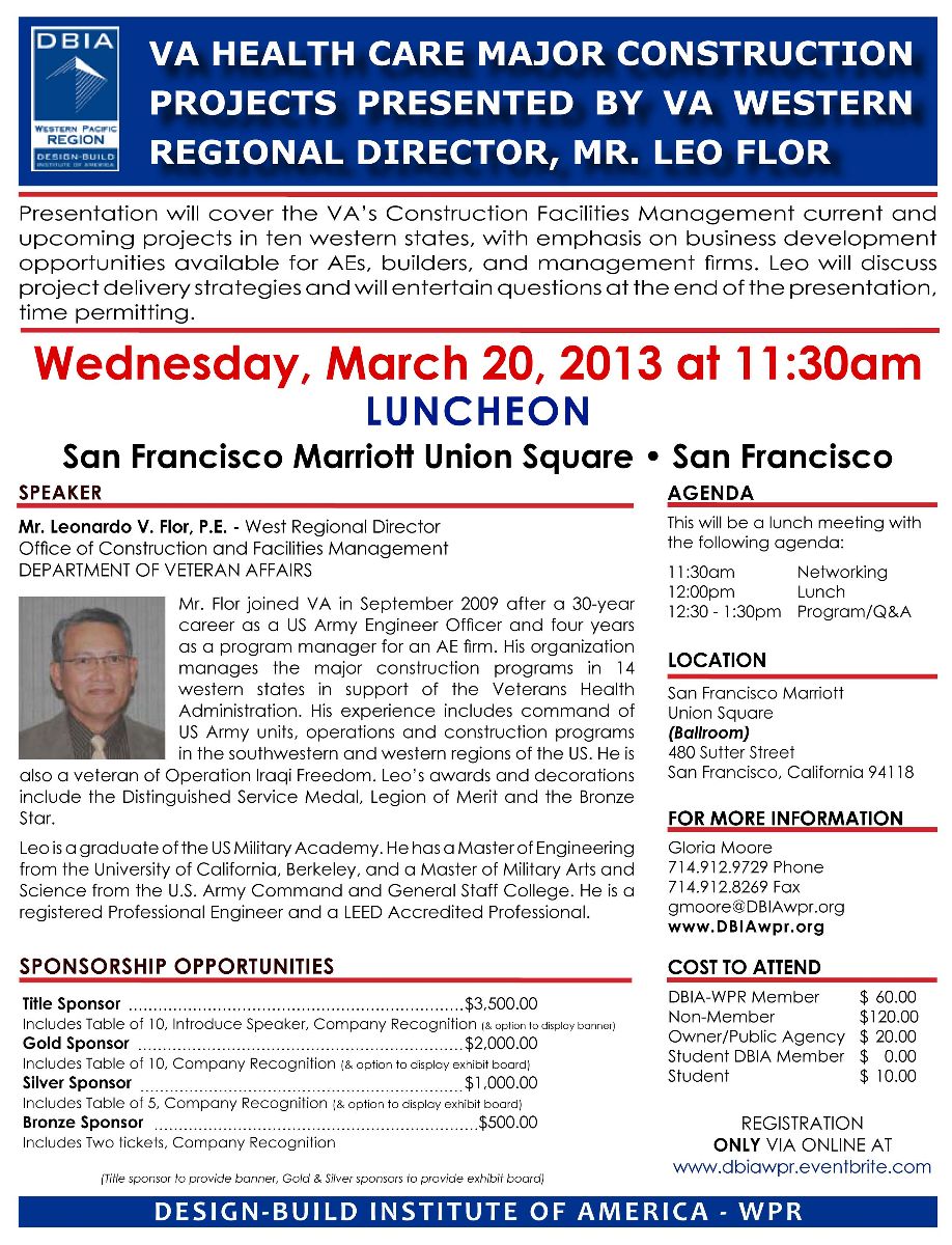 Presentation will cover the VA’s Construction Facilities Management current and upcoming projects in ten western states, with emphasis on business development opportunities available for AEs, builders, and management firms. Leo will discuss project delivery strategies and will entertain questions at the end of the presentation, time permitting.