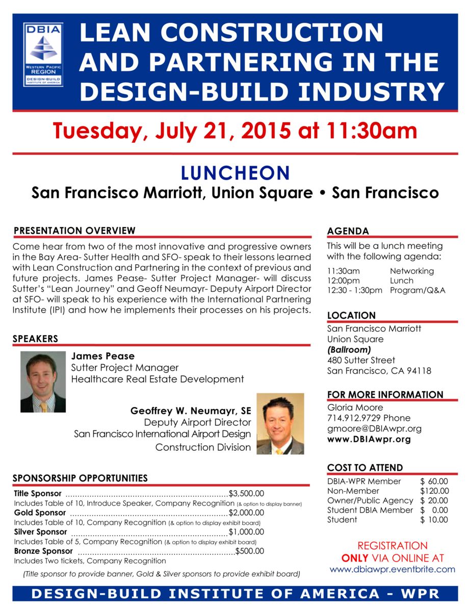 Description: Bay Chapter Lunch Program, LEAN CONSTRUCTION AND PARTNERING IN THE DESIGN-BUILD INDUSTRY. Come hear from two of the most innovative and progressive owners in the Bay Area- Sutter Health and SFO- speak to their lessons learned with Lean Construction and Partnering in the context of previous and future projects.