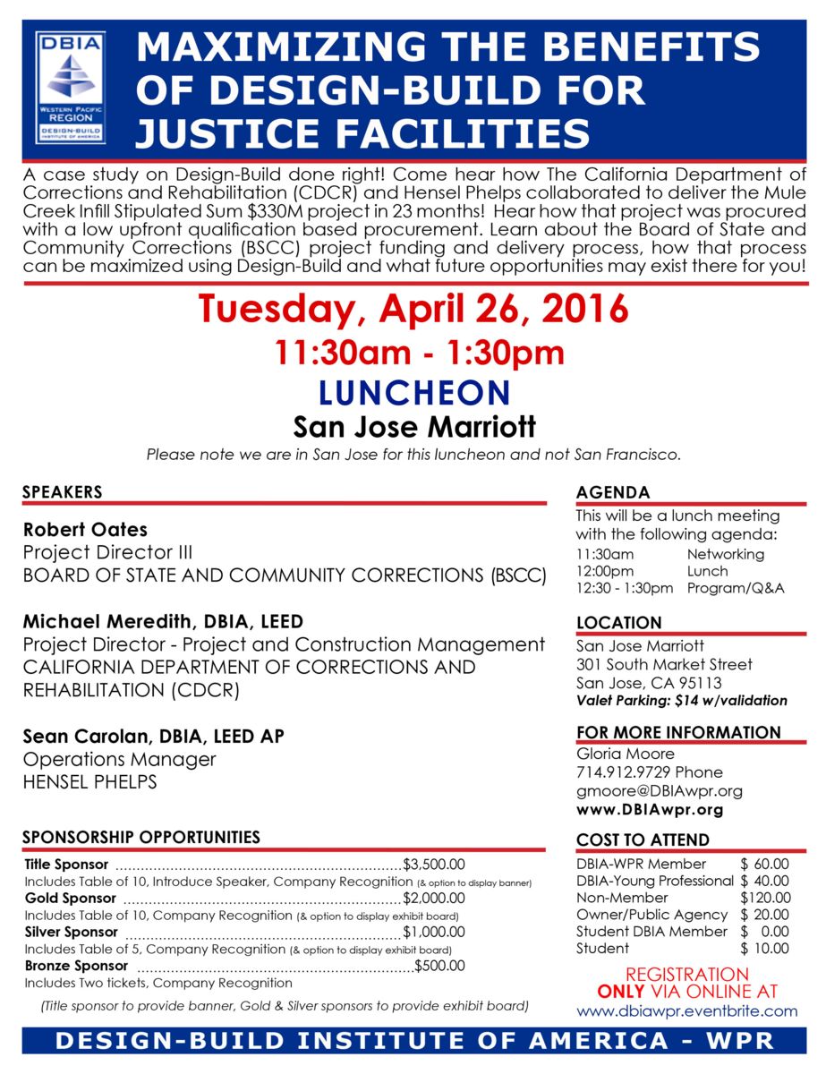 Description: Bay Chapter Lunch Program: “MAXIMIZING THE BENEFITS OF DESIGN-BUILD FOR JUSTICE FACILITIES" with the following speakers: