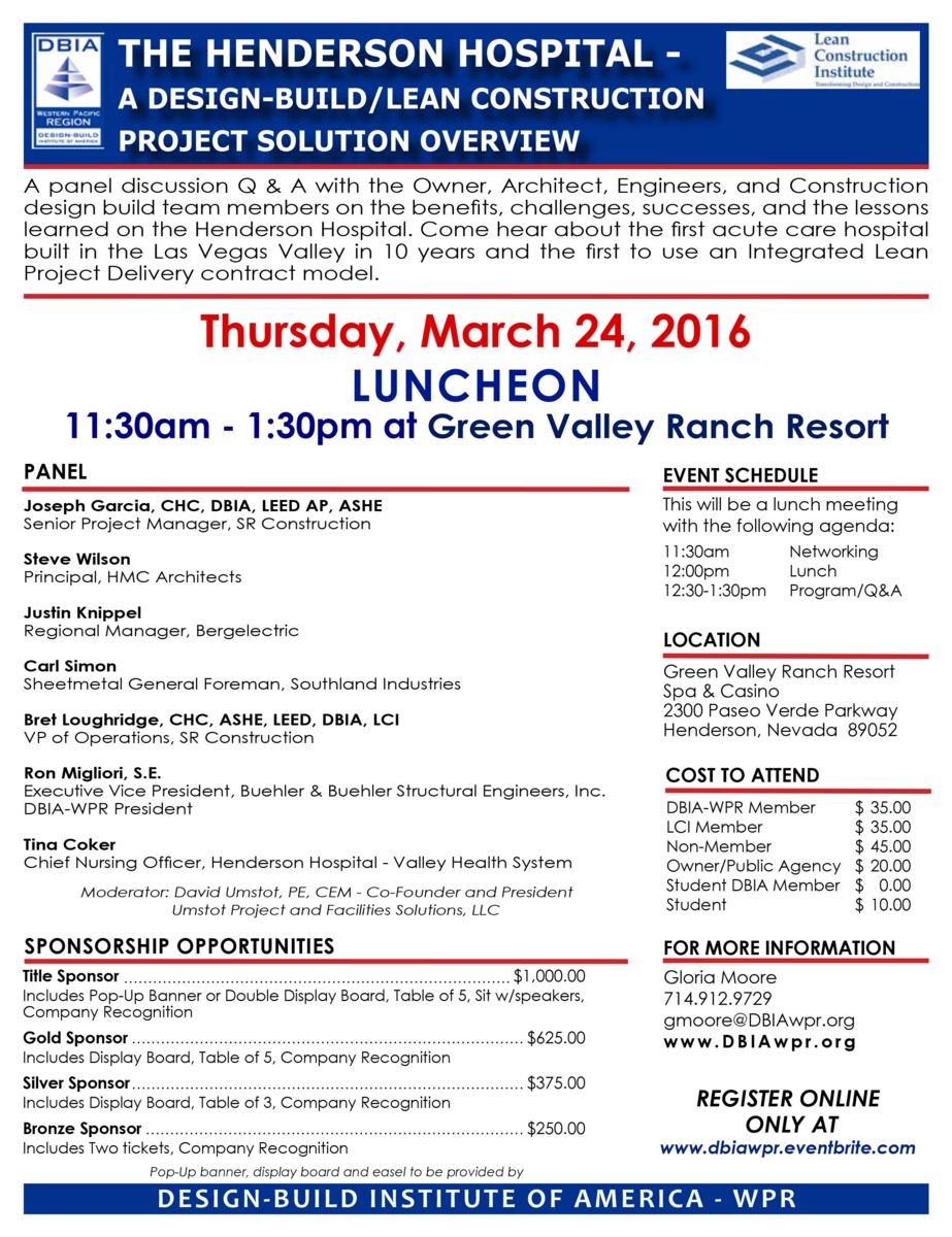 Description: Nevada Chapter Luncheon Program: THE HENDERSON HOSPITAL - A DESIGN-BUILD/LEAN CONSTRUCTION PROJECT SOLUTION OVERVIEW. Come hear about the first acute care hospital built in the Las Vegas Valley in 10 years and the first to use an Integrated Lean Project Delivery contract model.