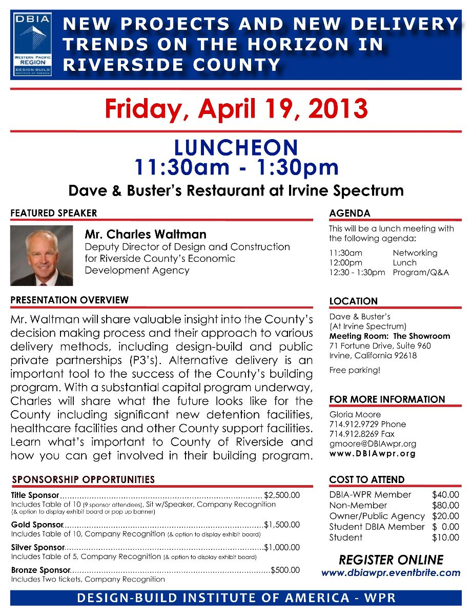 Mr. Waltman will share valuable insight into the County’s decision making process and their approach to various delivery methods, including design-build and public private partnerships (P3’s). Alternative delivery is an important tool to the success of the County’s building program. With a substantial capital program underway, Charles will share what the future looks like for the County including significant new detention facilities, healthcare facilities and other County support facilities. Learn what’s important to County of RIverside and how you can get involved in their building program.