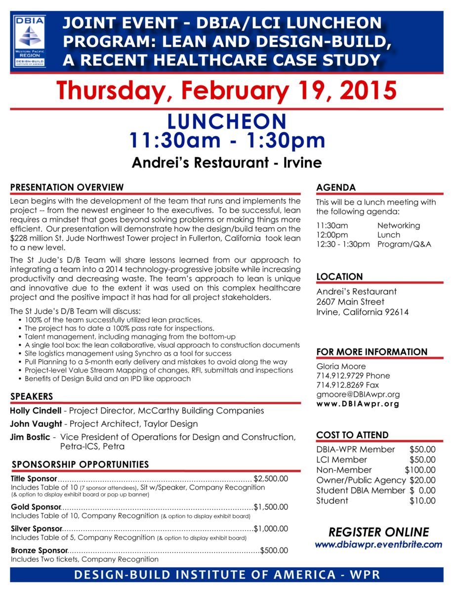 Description: OC/LA Luncheon Presentation: JOINT EVENT - DBIA/LCI LUNCHEON PROGRAM: LEAN AND DESIGN-BUILD, A RECENT HEALTHCARE CASE STUDY. Lean begins with the development of the team that runs and implements the project -- from the newest engineer to the executives. To be successful, lean requires a mindset that goes beyond solving problems or making things more efficient. Our presentation will demonstrate how the design/build team on the $228 million St Jude Northwest Tower project in Fullerton, California took lean to a new level. The St Jude’s D/B Team will share lessons learned from our approach to integrating a team into a 2014 technology-progressive jobsite while increasing productivity and decreasing waste. The team’s approach to lean is unique and innovative due to the extent it was used on this complex healthcare project and the positive impact it has had for all project stakeholders.