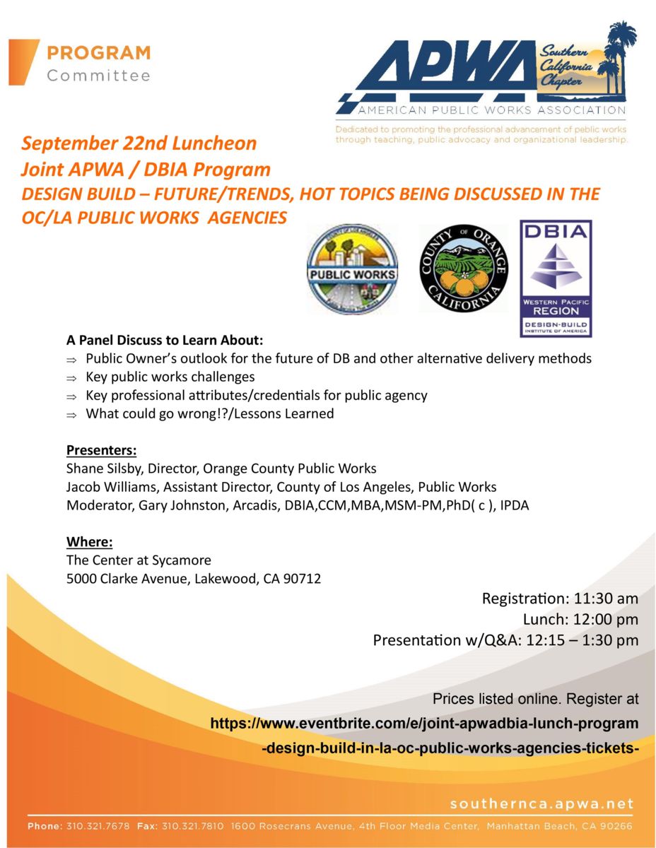 Description: Orange County/LA Chapter Luncheon Program. "Design Build - Future/Trends, Hot Topics Being Discussed in the OC/LA Public Works Agencies," a joint luncheon with APWA. Registrations for this luncheon will be taken by APWA, link below.
