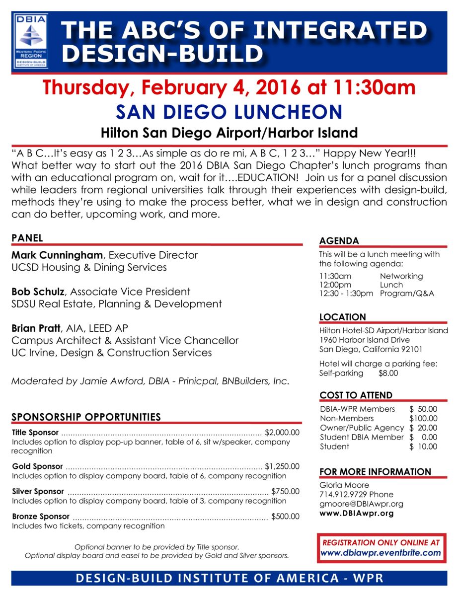 Description: San Diego Chapter Luncheon Program: THE ABC'S OF INTEGRATED DESIGN-BUILD. "A B C... It's easy as 1 2 3.. As simple as do re mi, A B C, 1 2 3..." Happy New Year!!! What better way to start out the 2016 DBIA San Diego Chapter's lunch programs than with an educational program on, wait for it...EDUCATION! Join us for a panel discussion while leaders from regional universities talk through their experiences with design-build, methods they're using to make the process better, what we in design and construction can do better, upcoming work, and more.