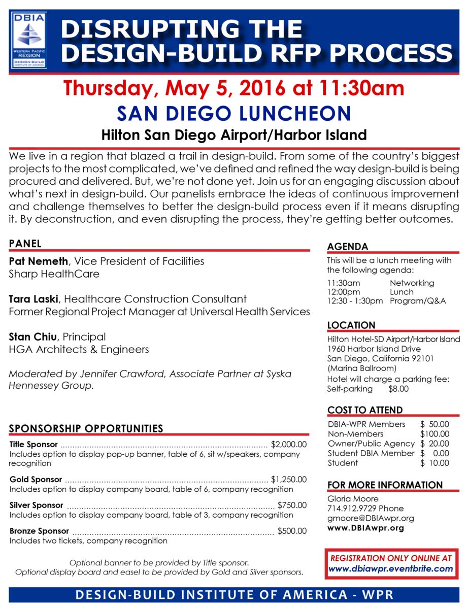 Description: San Diego Chapter Luncheon Program: "DISRUPTING THE DESIGN-BUILD RFP PROCESS". Join us for an engaging discussion about what's next in design-build. Our panelists embrace the ideas of continuous improvement and challenge themselves to better the design-build process even if it means disrupting it. By deconstruction, and even distrupting the process, they're getting better outcomes.