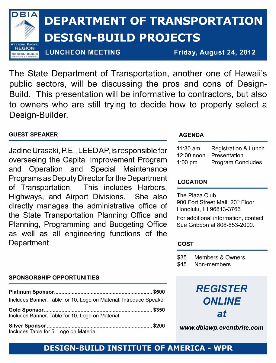 Description: The State Department of Transportation, another one of Hawaii’s public sectors, will be discussing the pros and cons of Design-Build. This presentation will be informative to contractors, but also to owners who are still trying to decide how to properly select a Design-Builder. Guest speaker Jadine Urasaki, P.E., LEED AP, is responsible for overseeing the Capital Improvement Program and Operation and Special Maintenance Programs as Deputy Director for the Department of Transportation.