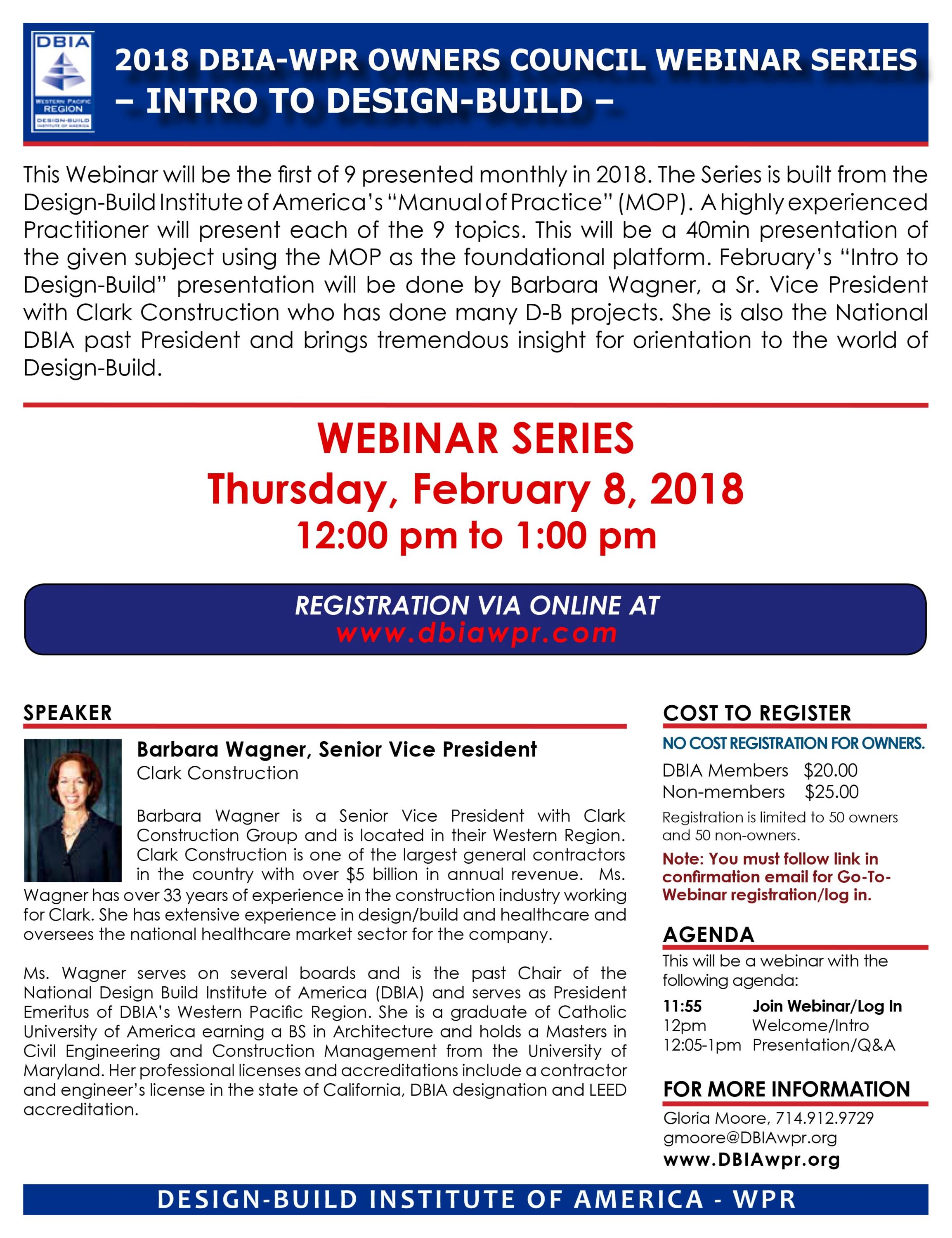 This Webinar will be the first of 9 presented monthly in 2018. The Series is built from the Design-Build Institute of America's "Manual of Practice" (MOP). A highly experienced Practitioner will present each of the 9 topics. This will be a 40min presentation of the given subject using the MOP as the foundational platform. February's "Intro to Design-Build" presentation will be done by Barbara Wagner, a Sr. Vice President with Clark Construction who has done many D-B projects. She is also the National DBIA past President and brings tremendous insight for orientation to the world of Design-Build.