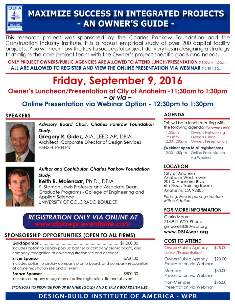 Description: Owners Only Luncheon/Presentation at City of Anaheim ~or via ~ Online Presentation via Webinar Option, MAXIMIZE SUCCESS IN INTEGRATED PROJECTS - AN OWNER'S GUIDE. This research project was sponsored by the Charles Pankow Foundation and the Construction Industry Institute. You will hear how the key to successful project delivery lies in designing a strategy that aligns the core project team with the Owner's project specific goals and needs.