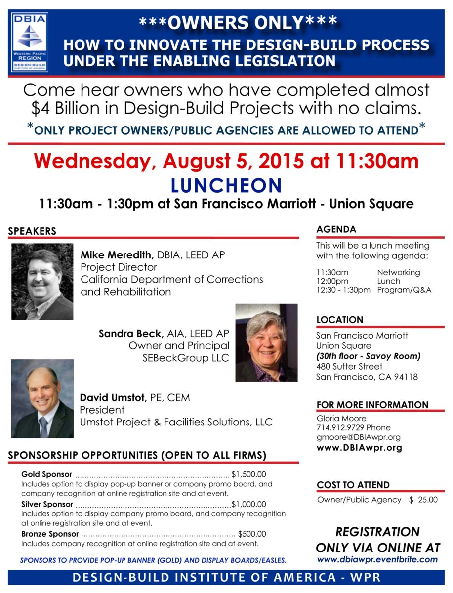 Description: Owners Only luncheon. Come hear owners who have completed almost $4 Billion in Design-Build projects with no claims.