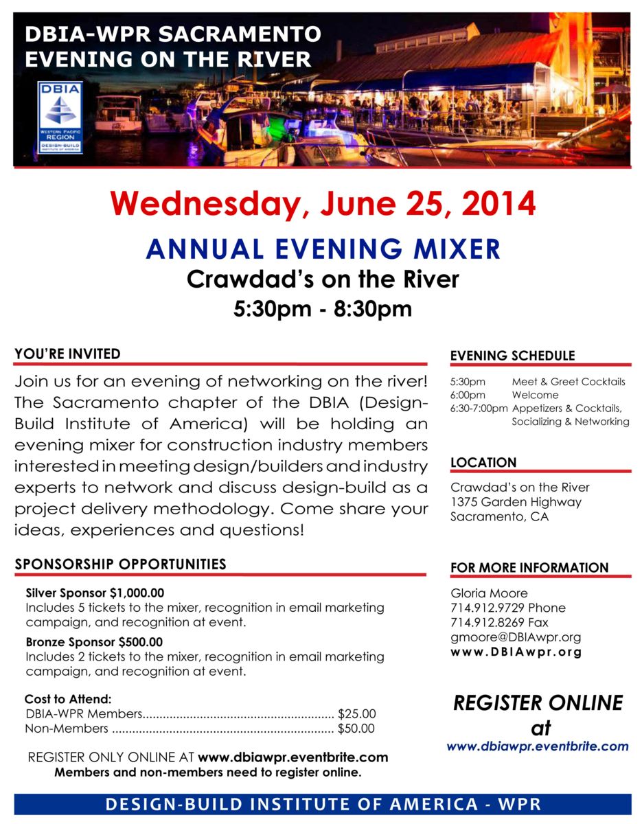 Description: Join us for an evening of networking on the river! The Sacramento chapter of the DBIA (Design-Build Institute of America) will be holding an evening mixer for construction industry members interested in meeting design/builders and industry experts to network and discuss design-build as a project delivery methodology. Come share your ideas, experiences and questions!