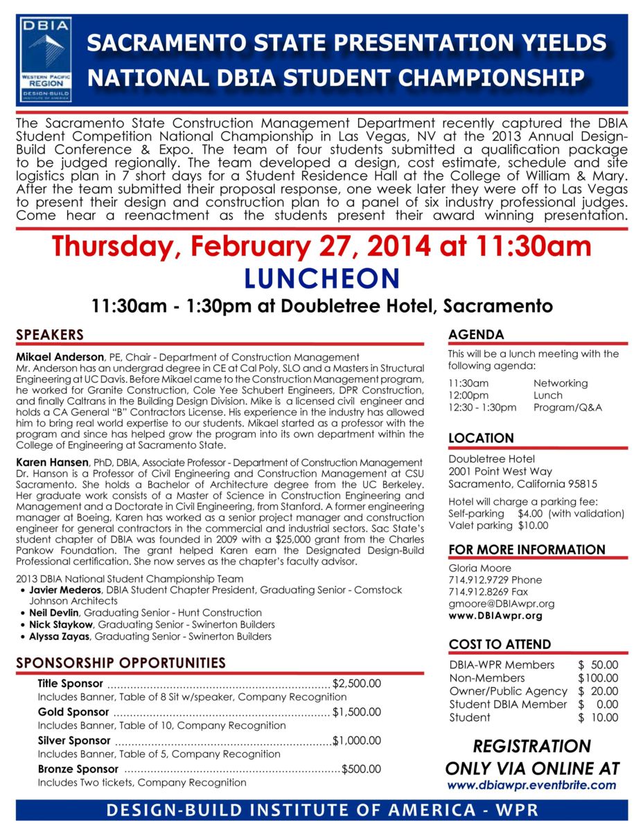 The Sacramento State Construction Management Department recently captured the DBIA Student Competition National Championship in Las Vegas, NV at the 2013 Annual Design-Build Conference & Expo. The team of four students submitted a qualification package to be judged regionally. The team developed a design, cost estimate, schedule and site logistics plan in 7 short days for a Student Residence Hall at the College of William & Mary. After the team submitted their proposal response, one week later they were off to Las Vegas to present their design and construction plan to a panel of six industry professional judges. Come hear a reenactment as the students present their award winning presentation.