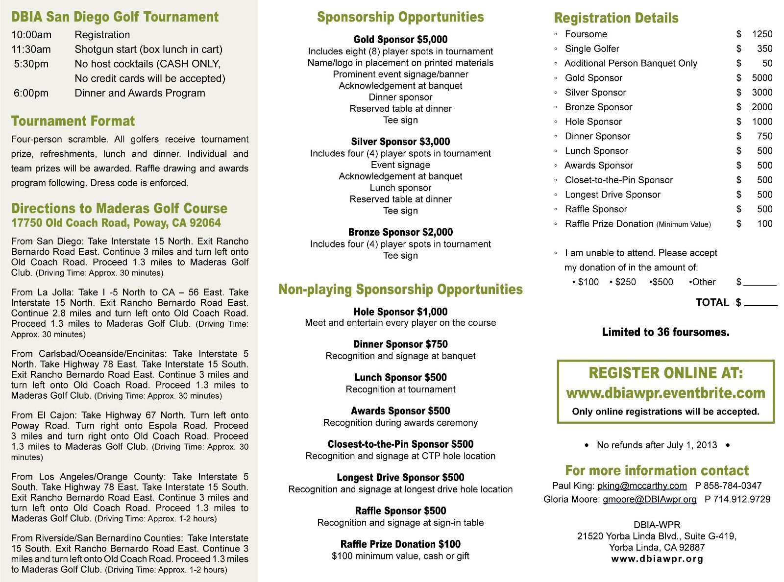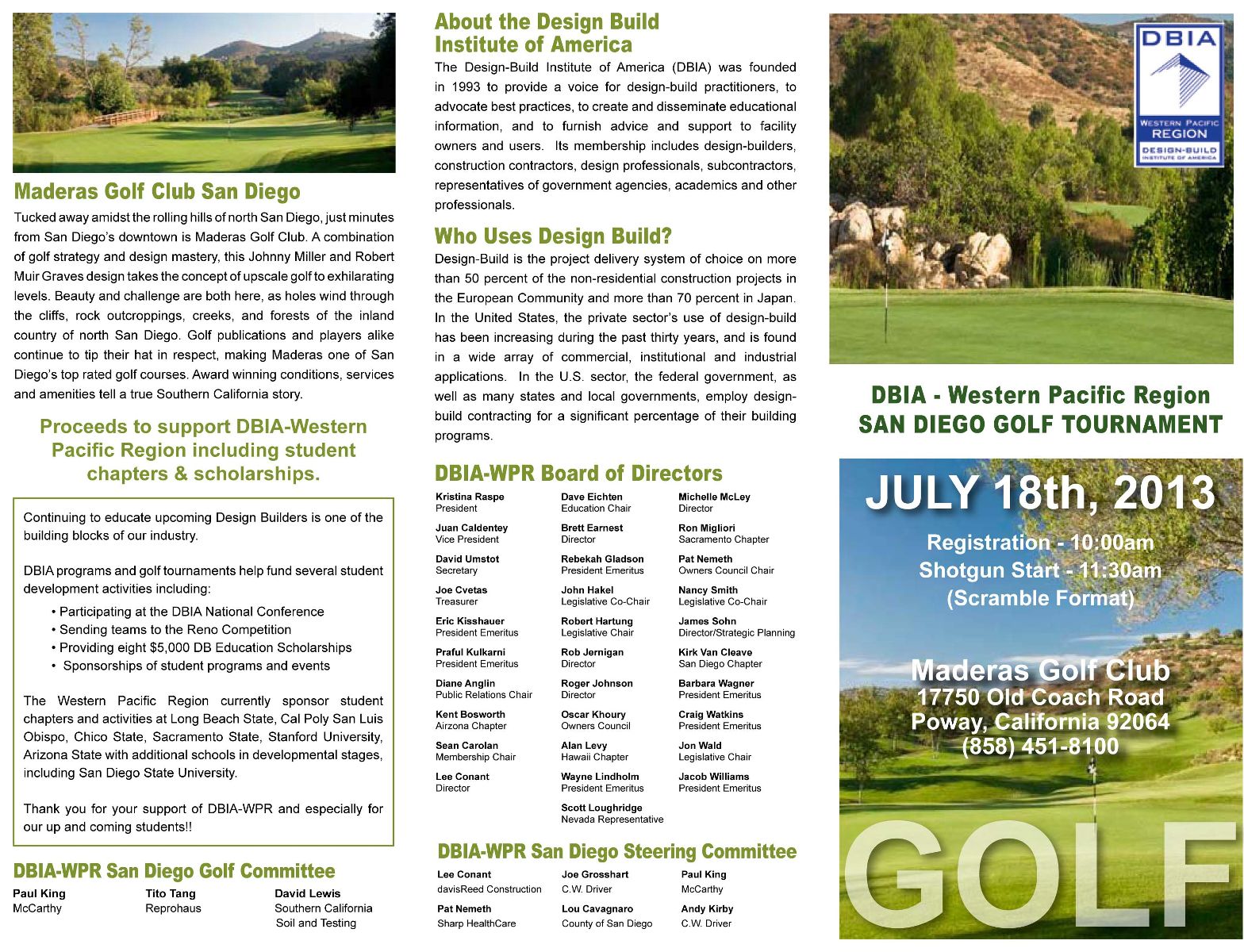 Description: Please join us on July 18th at Maderas Golf Club for the San Diego Chapter's 2013 DBIA-WPR Golf Tournament. See golf brochure below for further details.