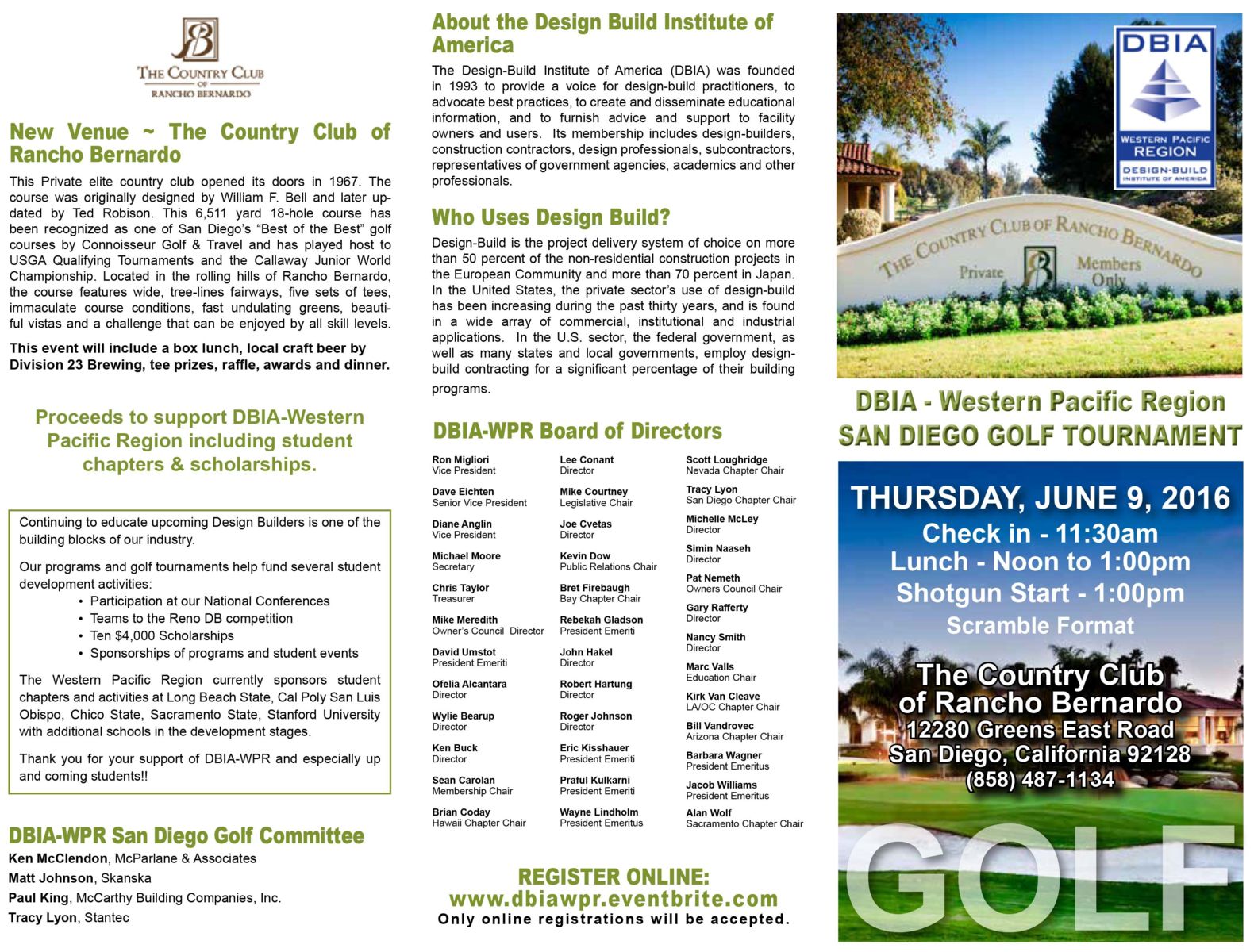 Description: San Diego Chapter Golf Tournament. New location this year at The Private Country Club of Rancho Bernardo. This event will include a box lunch, local craft beer by Division 23 Brewing, tee prizes, raffle, awards and dinner.